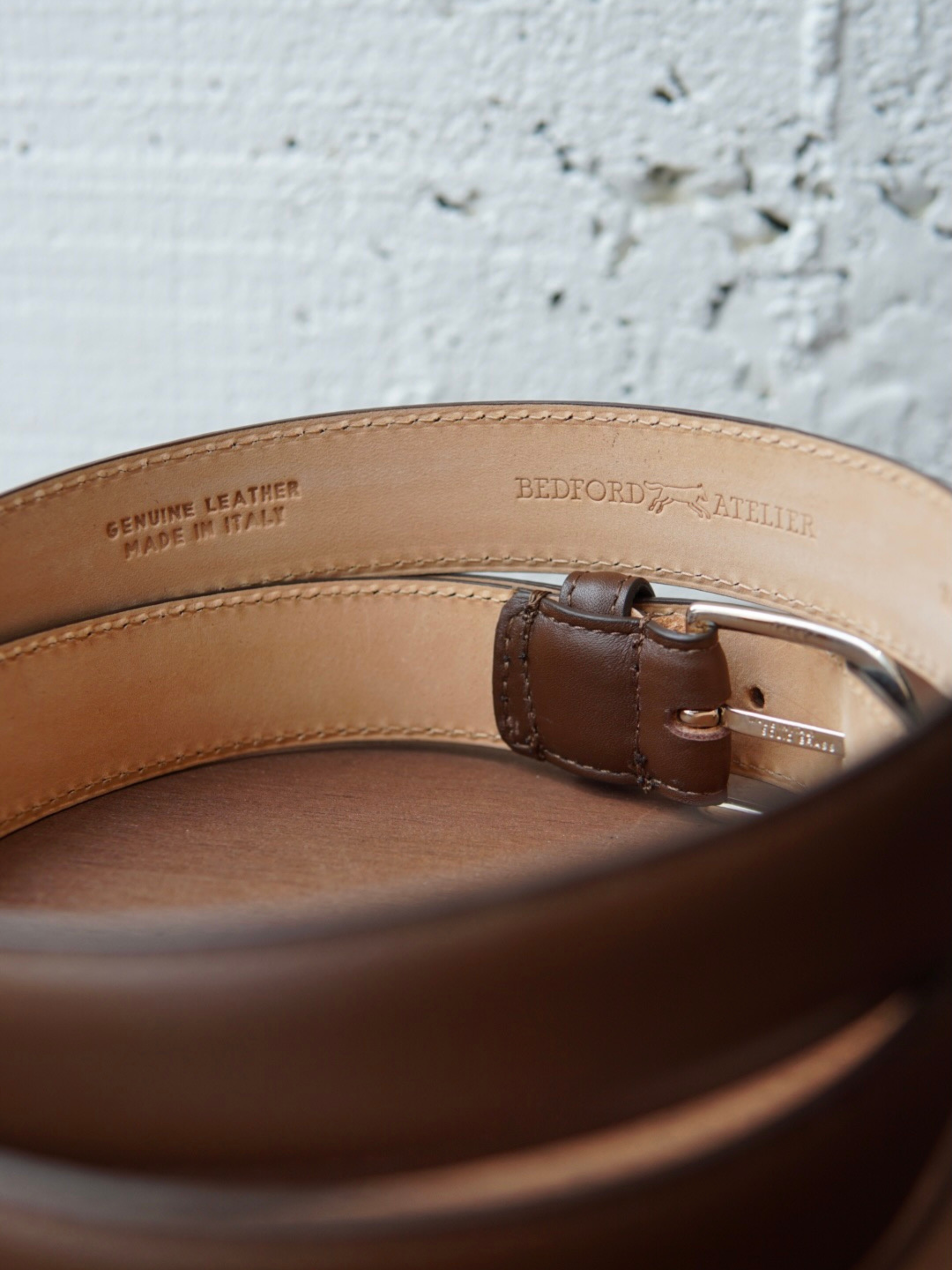 Fabriquée en Italie à partir d’un cuir lisse de haute qualité et une boucle en métal finition nickel matt, cette ceinture accompagnera tout vos costumes.